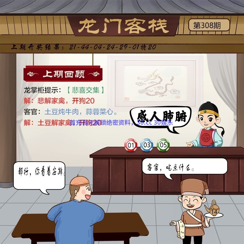 第308期掌柜:感人肺腑 解:使人内心深深感动。 小二:客官,吃点什么。 解:无。 客官:都行,你看着安排。 解:感人肺腑解吉肖的生肖兔、龙、蛇、马、羊、鸡。 推荐九肖:牛猴马狗龙鼠虎羊兔 |